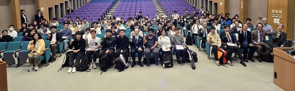 特別講義には、事前申込のあった約100名の本学学生が対面参加し、内堀知事は、未来を切り開くキーワードとして「希望」「危機」「挑戦」の3つを掲げ、震災、原発事故と度重なる「危機」に対するさまざまな「挑戦」を紹介。それらを「希望」に変えるためには、挑戦をし続けなければならないことを力強くお話くださいました。