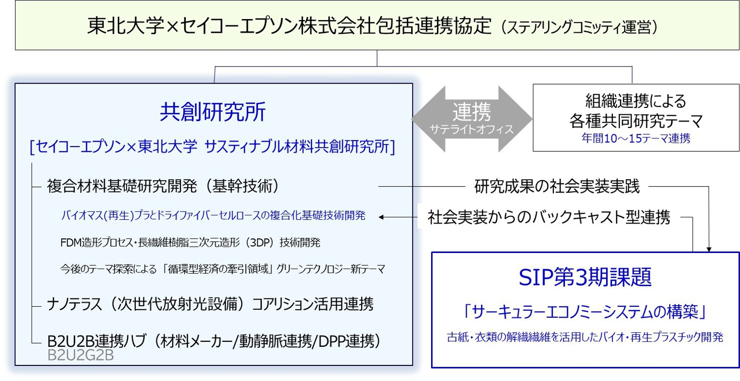 これらの活動を集大成することで、研究推進型の共創研究所として、「セイコーエプソン×東北大学 サスティナブル材料共創研究所」を設立し、貴学の資源を最大限に活用し、循環型経済牽引を実現する複合プラスチック材料基盤技術構築の技術開発研究、及び社会実装の加速化を図っています。