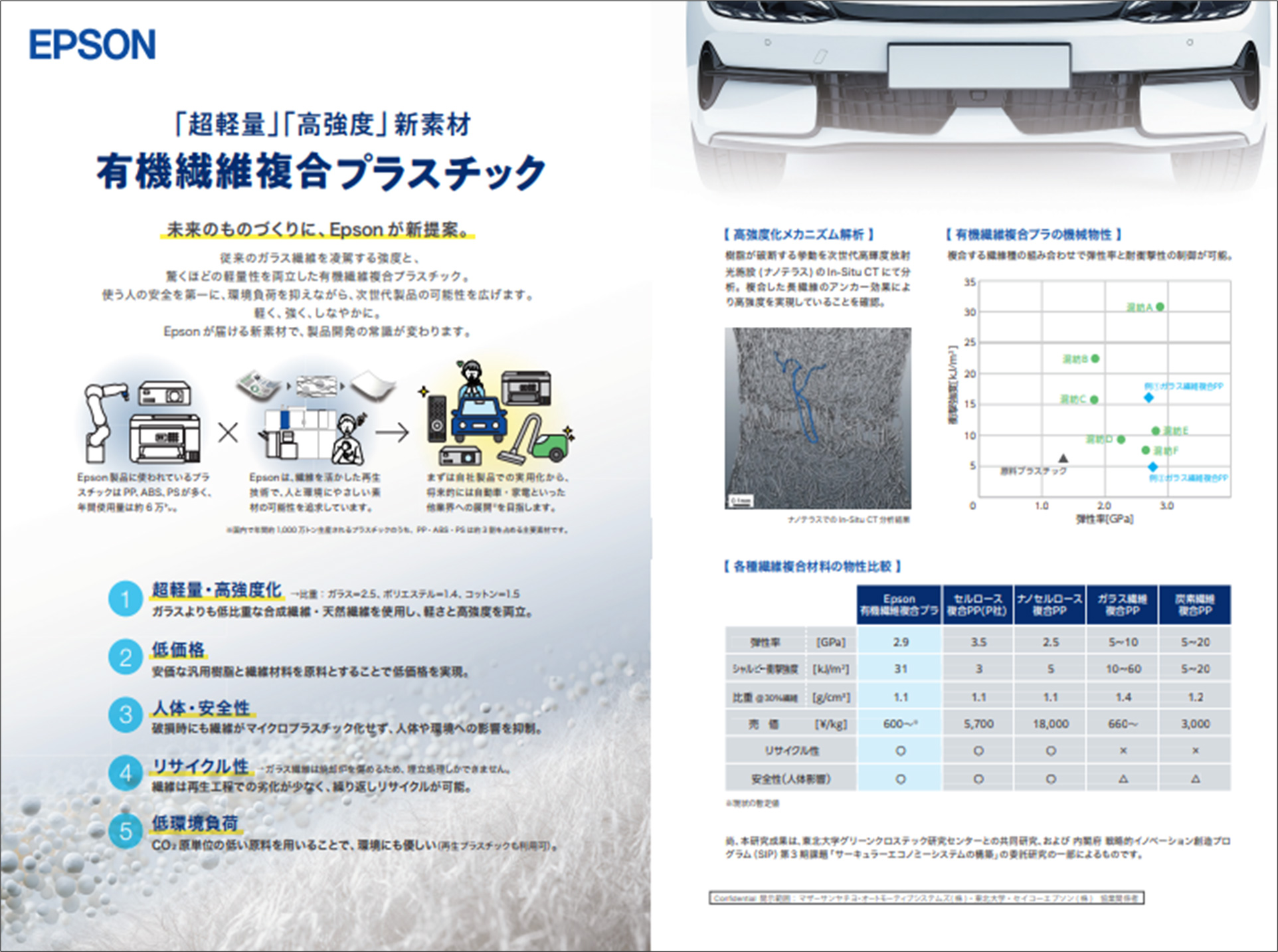 サーキュラーエコノミー(CE)技術として共創研究開発を進めることで得られた優れた材料機械特性は、CEに限定することなく繊維複合プラスチック材料として幅広く活用できる。