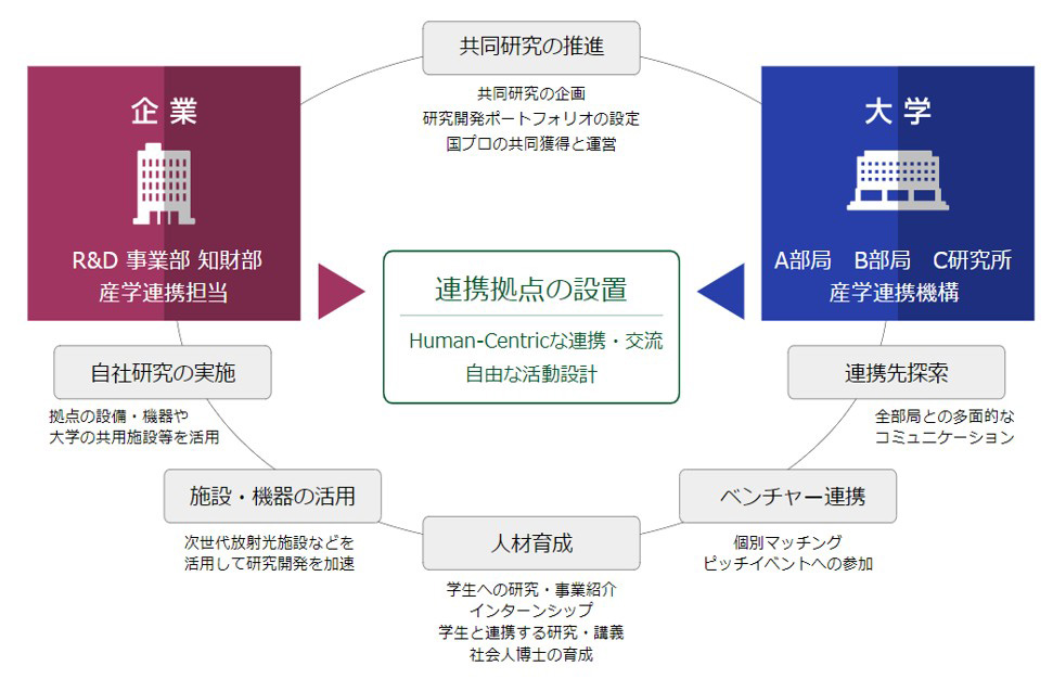大学内に企業との連携拠点を設けるとともに、大学の教員・知見・設備等に対する部局横断的なアクセスを可能とすることで、共同研究の企画・推進、人材育成、および大学発ベンチャーとの連携をはじめとする多様な連携活動を促進する制度です。